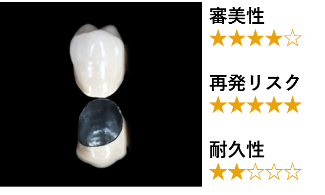 中が金属、外側はセラミックでできた素材の被せ物です。強度もあり審美的にも優れた素材です。強度が必要な部位にも適しております。